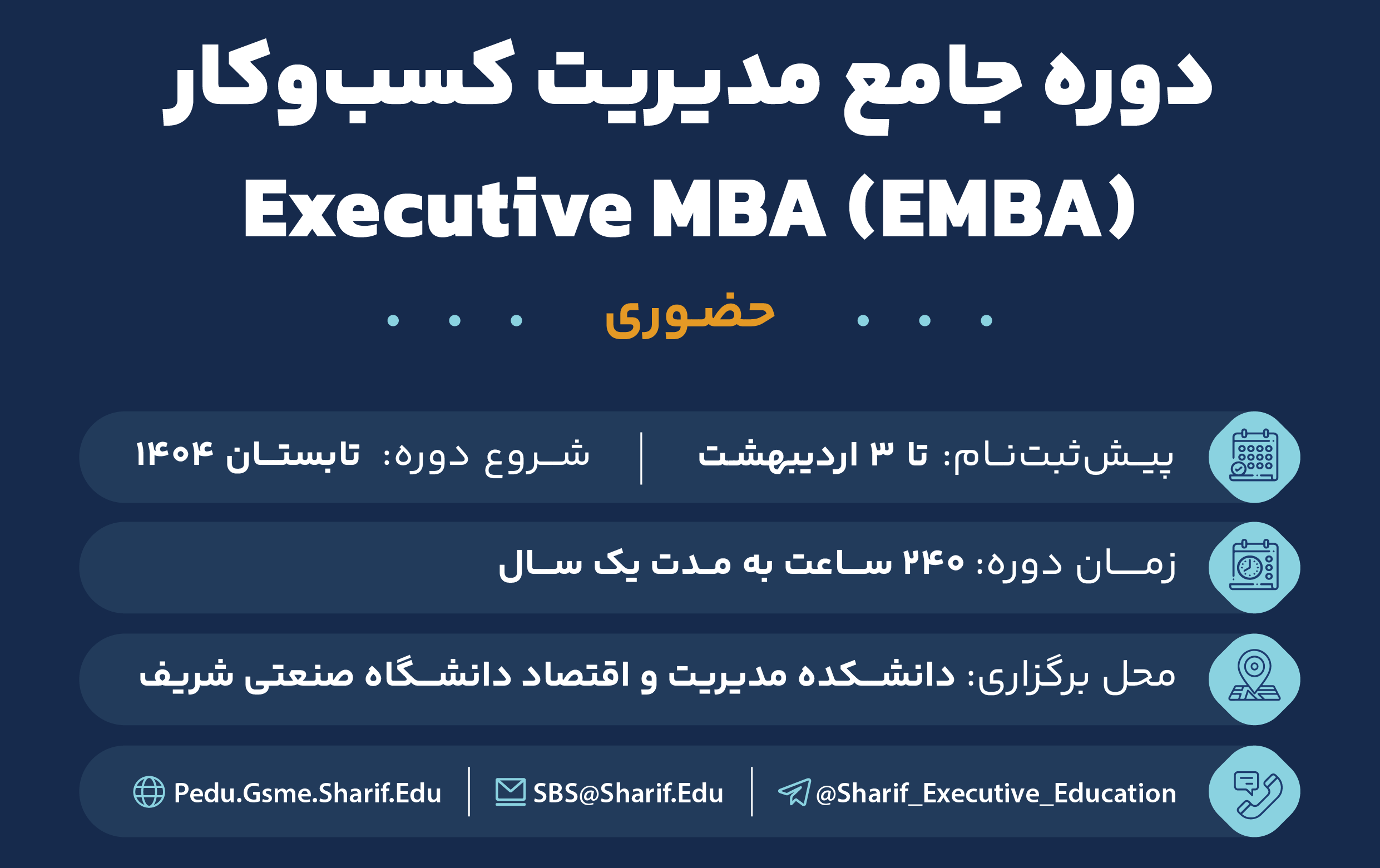 دوره EMBA دانشگاه صنعتی شریف برای مدیران اجرایی طراحی شده تا با ارتقاء مهارتهای رهبری و مدیریت، دیدگاهی جامع از ابعاد مختلف کسبوکار ارائه دهد.